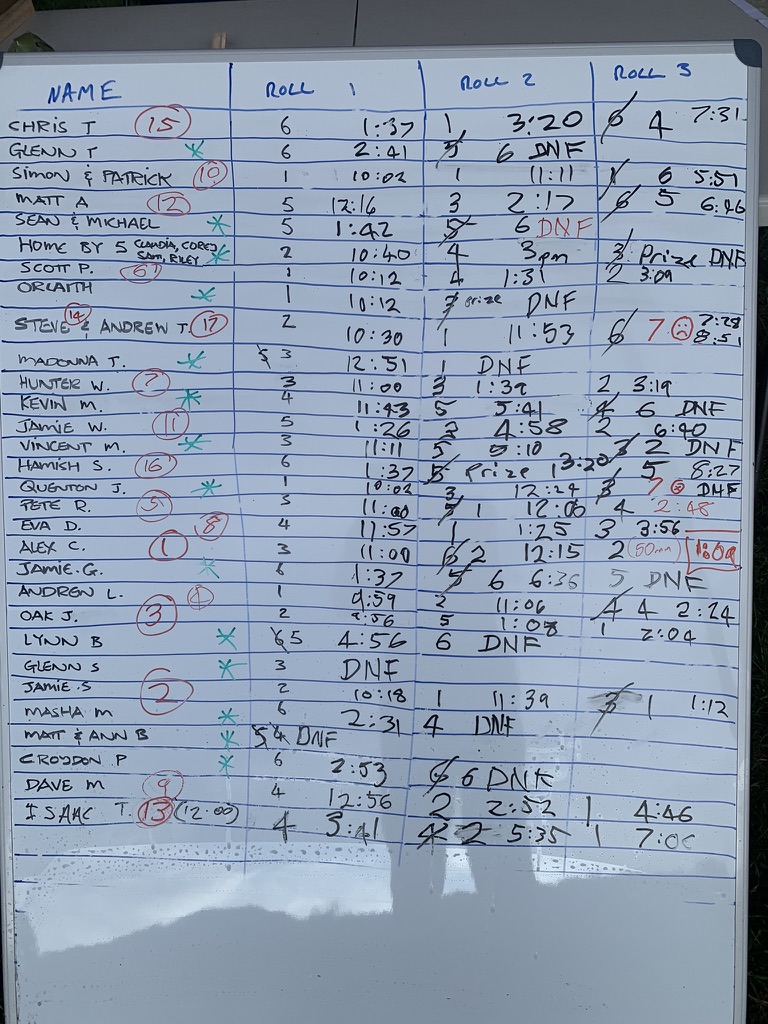Patrick Manulat and Simon Budd were notable in rolling 1 three times in a row. Loop 1 is close to the Pigs Backyard Ultra lap with about 2km of flat extra. They didn’t come all the way from Invercargill just for a flat run so on the 3rd they rejected it and went to the Wheel. A spin of 6 gave them something to write home about.